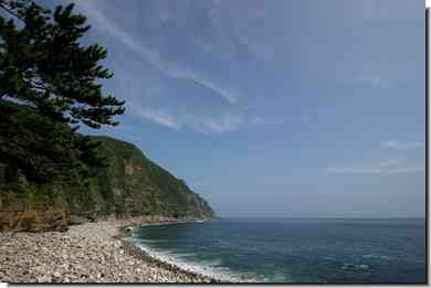 普段は海岸の全面に玉石が散らばっていますが、毎年夏直前に玉石で堤防が作られ、内側がプールの様なり、砂も入れら海水浴場として整備されます。