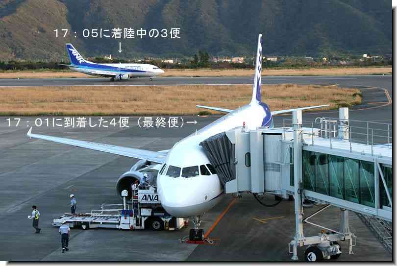 投稿日: 2005年10月1日 投稿者: sgkadmin珍事!3便より先に4便着 2便の一時間以上の遅れを取り戻す事が出来ずに、大島によっている間に、4便に追い越されてしまった3便。 「わしの位置に!」っと睨みをきかせる後からきたボーイング737-500だが、先に着陸したエアバスA320は知らん顔。 ボーイング737-500はすごすごと右に誘導されて行った
