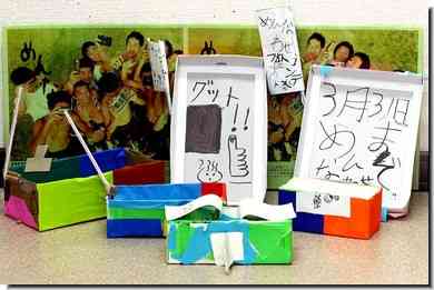 温泉などの施設に置く、めんなわせフォトコンテストのパンフレットを入れておく箱ですが、島の子供達による手作りです。