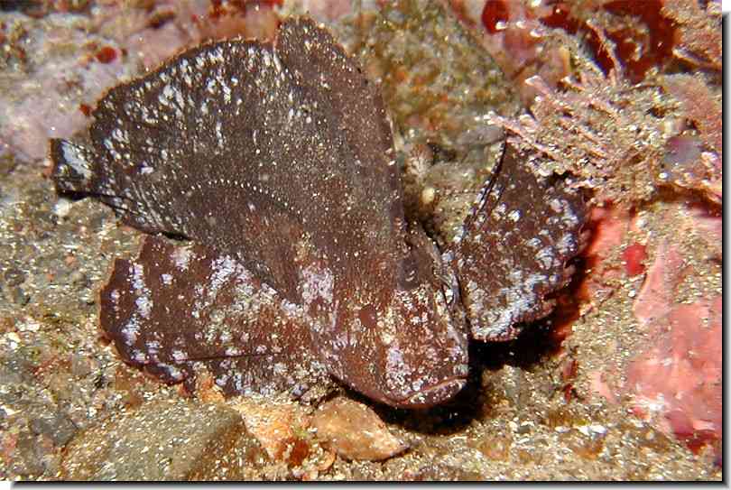 投稿日: 2005年10月4日ツマジロオコゼ 和名:つまじろおこぜ 学名:Ablabys taenianotus 科:ハオコゼ科 体長:5cm 撮影地:旧八重根港/水深 7m 砂地のゴミや枯葉が溜まっているいるような場所で、一緒に揺られ身を隠しているツマジロオコゼ。 枯葉色で一見地味に見えるが、目の直前から始まる立派な背ビレが特徴である。 そしてほとんど泳ぐことなく、砂地の上を赤い目をして、あっちにいったり、こっちにいったりと千鳥足。 まるで酔っぱらいのようで、どーも共感がもててしまうのは私だけでないはず。 「つまじろ」とは端が白い事なのだが、