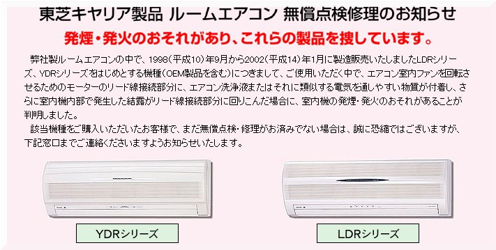 東芝キヤリア株式会社製ルームエアコンの中で、1998(平成10)年9月から2002(平成14)年1月に製造販売いたしましたLDRシリーズ、YDR シリーズをはじめとする機種(OEM製品を含む)につきまして、ご使用いただく中で、エアコン室内ファンを回転させるためのモーターのリード線接続部分 に、エアコン洗浄液またはそれに類似する電気を通しやすい物質が付着し、さらに室内機内部で発生した結露がリード線接続部分に回りこんだ場合に、室内機の 発煙・発火のおそれがあることが判明しました。